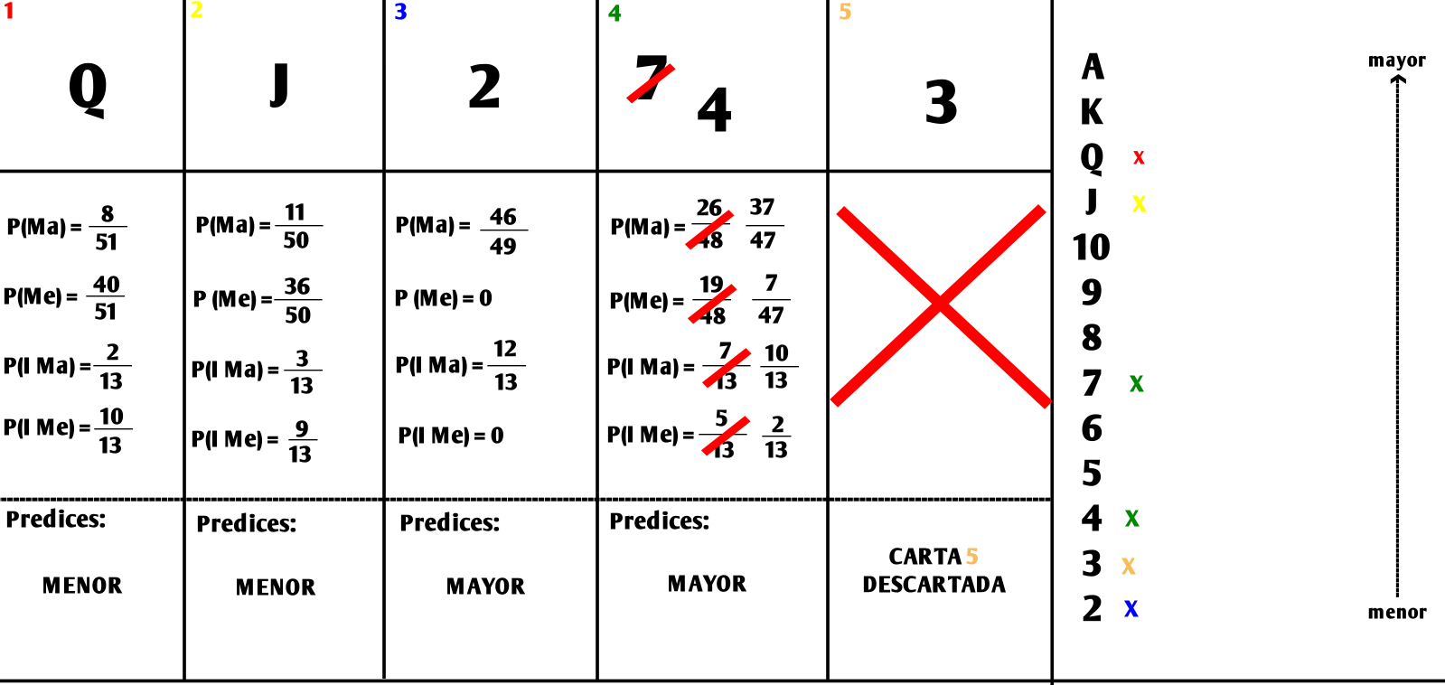 - Como la carta base es Q, es obvio que vas a predecir que la próxima carta es menor, más aún cuando P (Me) es mayor que P (I Me). El mismo fenómeno ocurre con la segunda carta.